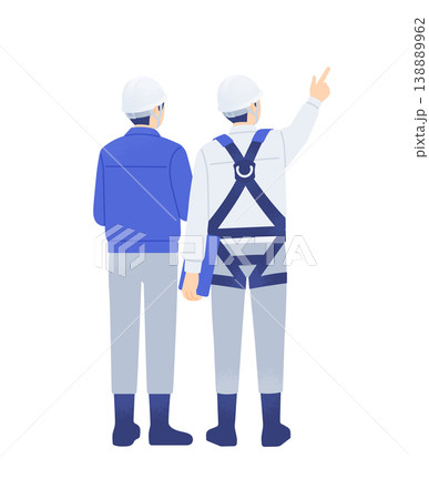 ヘルメットとフルハーネスを身につけた後ろ姿 指差ししながら打ち合わせをする作業員のイラスト素材