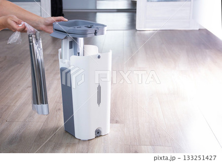 Washing and cleaning the room with a modern mop with a bucket and wringer. Modern novelty for cleaning. Copy space for text, automatic spin