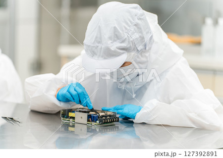 クリーンルームで精密機器を扱う作業員の女性(勉強)