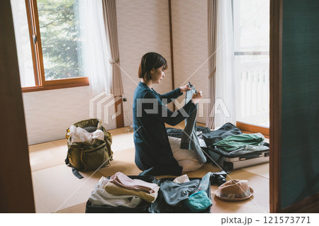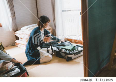 旅館でスーツケースに洋服を入れて帰り支度をする女性