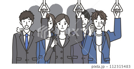通勤ラッシュの満員電車で疲労する人のイラスト