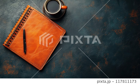 Elegant Workspace with Leather Notebook, Pen, and Coffee on Dark Rustic Background