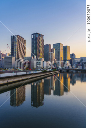 朝焼けがビルを染める中之島の風景(越中橋からの眺め)