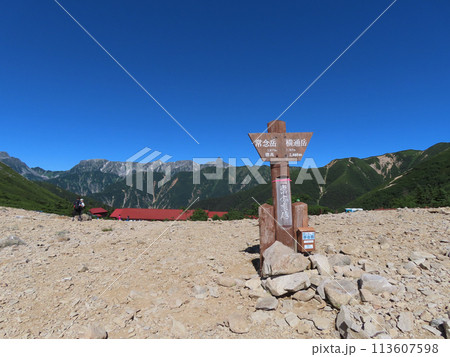 常念乗越の看板と常念小屋と槍ヶ岳の眺め