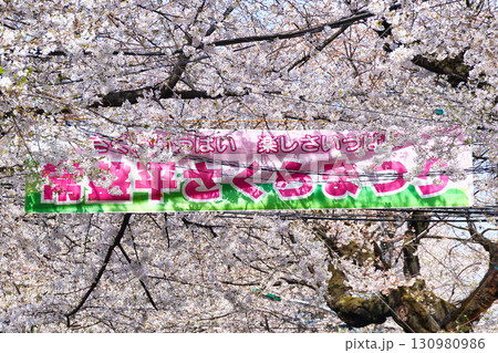 満開の桜に彩られた常盤平さくらまつりの横断幕