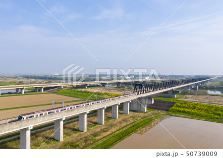 利根川を渡るつくばエクスプレスと常磐自動車道を俯瞰撮影