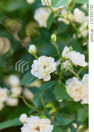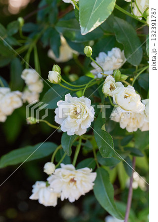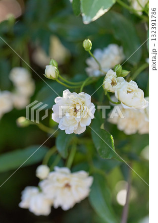 晴れた日の屋外に咲く八重咲き淡黄花モッコウバラの花(自然光+マクロ接写写真)