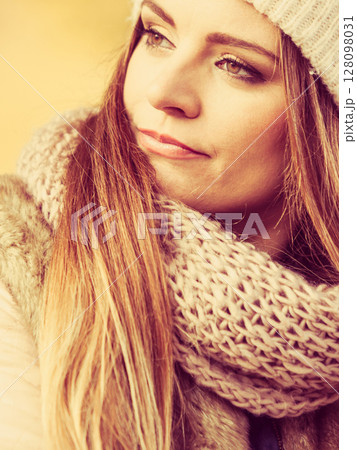 Funny fashion model woman in blue classic hat and white fur coat posing indoor