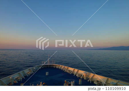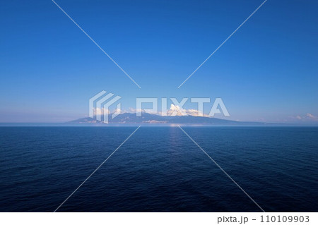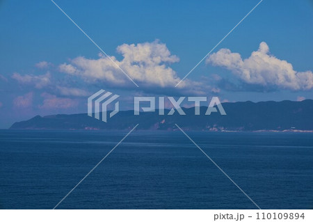 夏の北海道、日本海側のフェリーから絶海の孤島、奥尻島を望む、裏側の奥尻島、断崖絶壁の離島、夏から秋へ