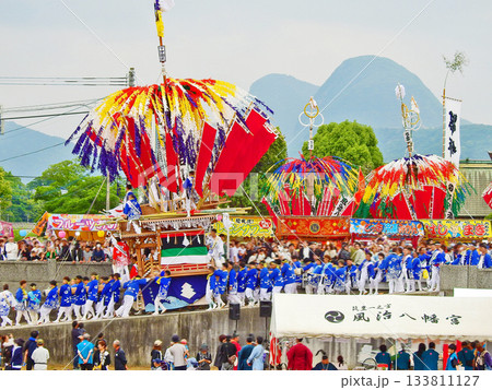 福岡県田川市の風治八幡宮川渡り神幸祭で彦山川に並ぶ幟山笠