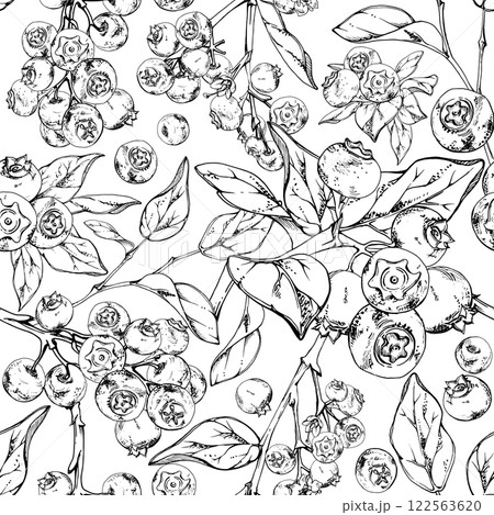 Blueberry blackberry with plant leaves, hand drawn in ink vector, forest berry in group clusters on branches. Seamless banner garland illustration, for restaurant, cafe menu, wedding, farmers market