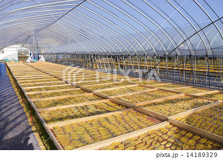 干し芋を作る工程 干しざるに並べたサツマイモを天日干しにする