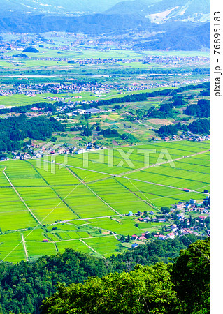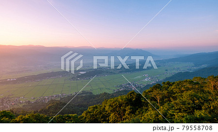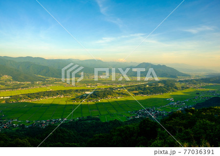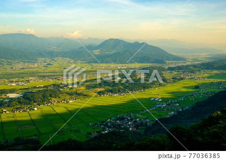 夏の田園風景(夕方):平丸峠より飯山市の眺め