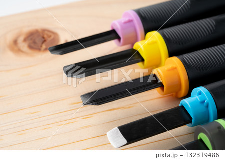 木板と彫刻刀の刃先のクローズアップ