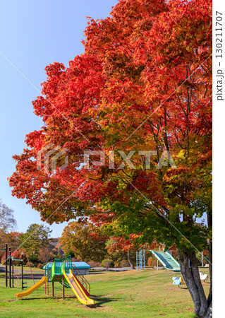 北海道平取町、公園で鮮やかに色付く木とすべり台【10月】