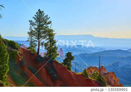 Red Rock Cliffs Pine Trees and Layered Mountain View at Sunrise