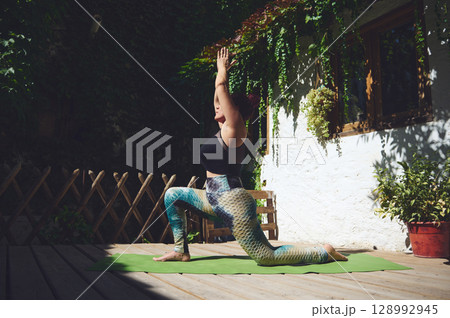 Woman Practicing Outdoor Yoga in a Serene Brightly Lit Garden