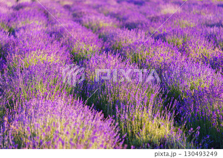 Rows of vibrant blooming purple lavender flower in field in full summer light stretching to horizon