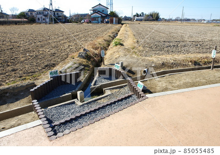 埼玉県と群馬県と栃木県の田園地帯の県境にある三県境の冬景色