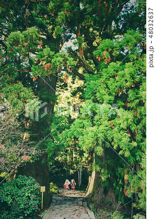 夫婦杉と平安衣装の旅女性