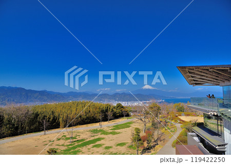 中部・日本平・日本平夢テラス・富士山と駿河湾の美しい眺めを展望フロアで楽しむ観光客・静岡県静岡市