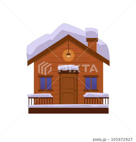 Wooden house with snow on roof and railing flat style, vector illustration