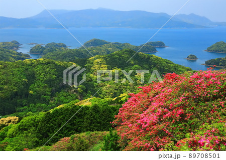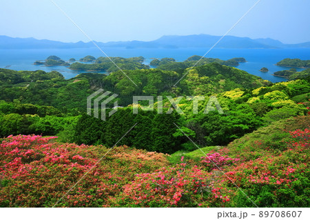 【長崎県】晴天下の九十九島と躑躅(佐世保 長串山公園)