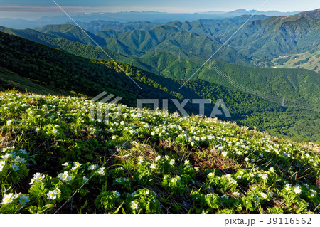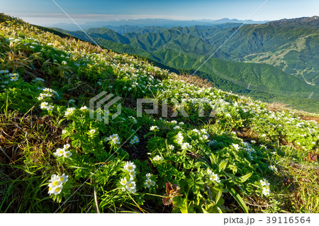 上越国境・平標山のお花畑と朝の山並み