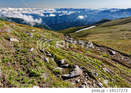 高山植物咲く平標山稜線と越後の山並み
