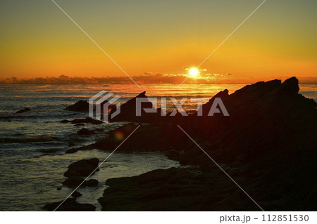 平磯海岸の白亜紀層岩礁に太平洋の霧立つ海面からの日の出