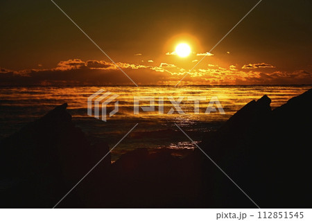 ひたちなか市平磯海岸の白亜紀層岩礁に太平洋と朝焼け