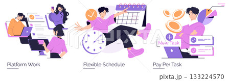 Vector illustration showcasing collaborative platform work, flexible scheduling, and pay-per-task concept. Features diverse individuals engaging in digital work environments.