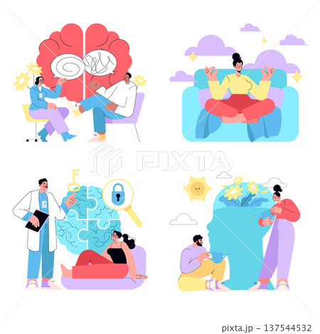 Colorful vector illustration depicting mental health themes. Features people engaging in therapy, meditation, and self-care, promoting wellness, relaxation, and positive mindset.