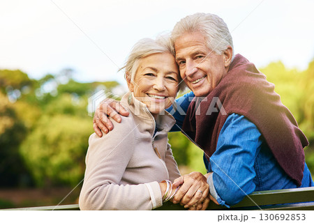 Old couple in portrait, relax in the park with smile, happiness together with bonding in nature, love and retirement. Happy, man and woman with travel, relationship with marriage and commitment
