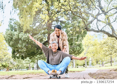 Skateboard, portrait and senior friends in park for goofy, silly and comic outdoor fun together. Funny retirement women in nature with excited and happy smile for bonding leisure in Mexico.