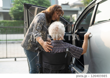 Caregiver help Asian elderly woman disability patient sitting on wheelchair in hospital.