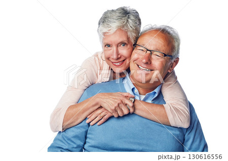 Love, portrait and senior couple hug in studio, smile and happy together against a white background. Relax, face and elderly man with woman embrace, holding and enjoy retirement, bond and isolated