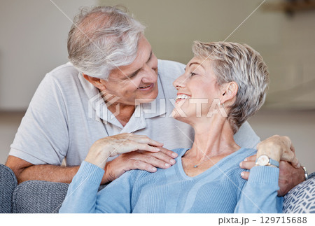 Love, senior couple and relax on a sofa, smile and happy while sharing intimate moment, bond and romance in living room. Happy family, retirement and senior embrace on a couch, in love and relaxing