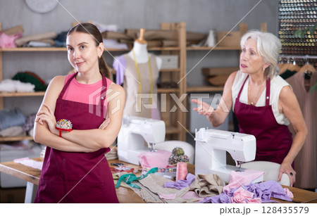 Senior woman head of sewing workshop yells at her subordinate female seamstress,
