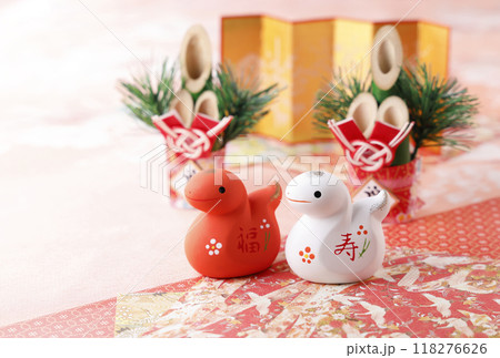 2025年年賀状素材・巳年・蛇の置物・赤色バック