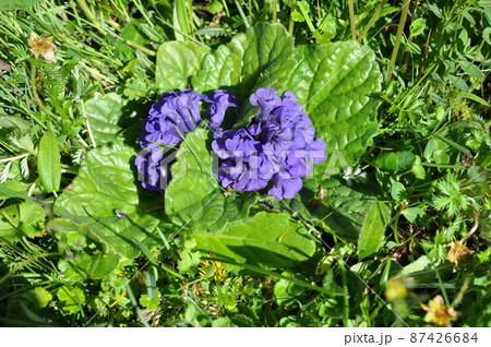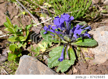 中国 青海省 年保玉則山国家地質公園 仙女湖湖畔に咲くシソ科キランソウ属Ajuga ovalifol