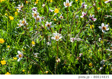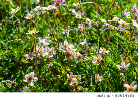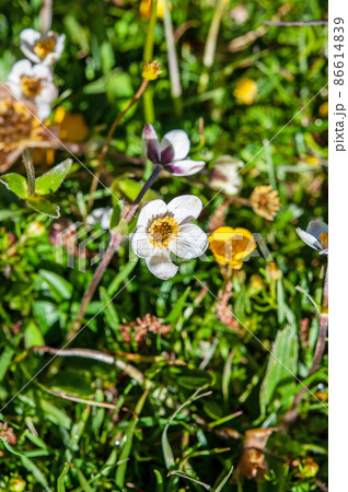 中国 青海省 年保玉則山国家地質公園 仙女湖湖畔に咲くキンポウゲ科、イチリンソウ属 Anemone