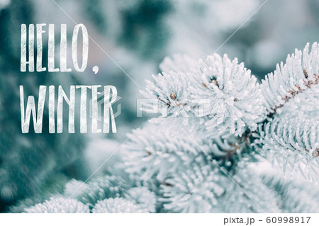 Hello Winter text on snow-covered branches of blue