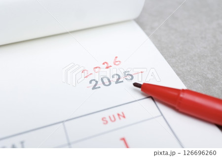 カレンダーの2025の文字を消して赤ペンで2026に修正