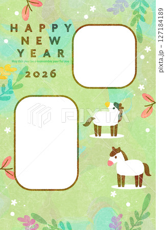2026年午年の年賀状テンプレート。馬、かわいい、縁起物、ベクター、うま
