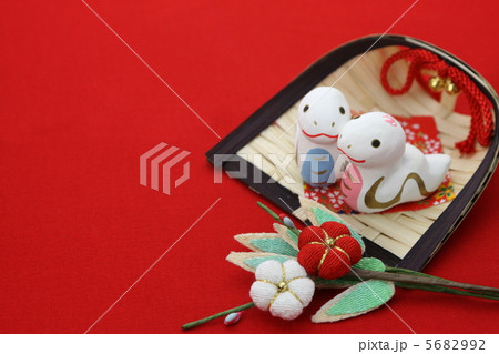 2025年年賀状素材・巳年・蛇の置物・赤色バック