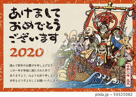 2020年賀状テンプレート「七福神と宝船」あけおめ 日本語添え書き付