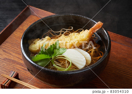 湯気立つ熱々の天ぷら蕎麦 年越しそばや冬の和食イメージにぴったりのあたたかい和食料理