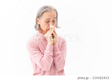 鼻をかむシニア女性 アレルギー