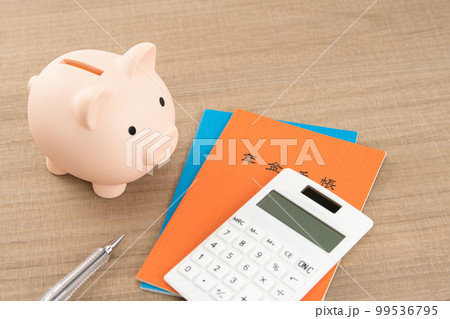 年金イメージ 年金手帳と電卓と豚の貯金箱